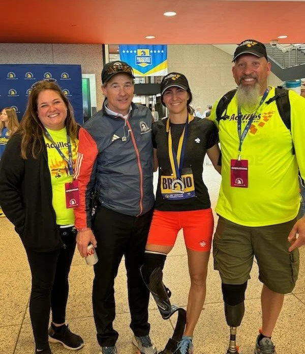 Group photo of Erin Spaulding, Chapter Lead of Achilles Connecticut, Jack Fleming, President and CEO of the Boston Athletic Association, Elite Para Athlete Kelly Bruno, and Joe LeMar, Chapter Lead of Achilles Boston.